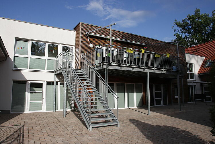 Die moderne Anlage befindet sich in direkter Nachbarschaft zu unserer DRK-Begegnungsstätte. Die Wohnanlage im 1. Obergeschoss verfügt über einen großzügige Terrasse. Im Erdgeschoss trifft sich regelmäßig unsere Bereitschaft und das JRK.