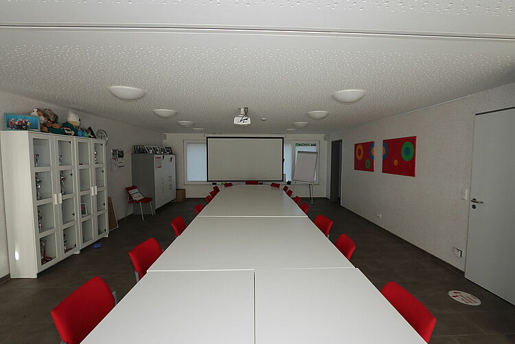 Der Gruppenraum im Erdgeschoss verfügt über 20 Sitzplätze und ist mit Beamer und Leinwand ausgestattet.