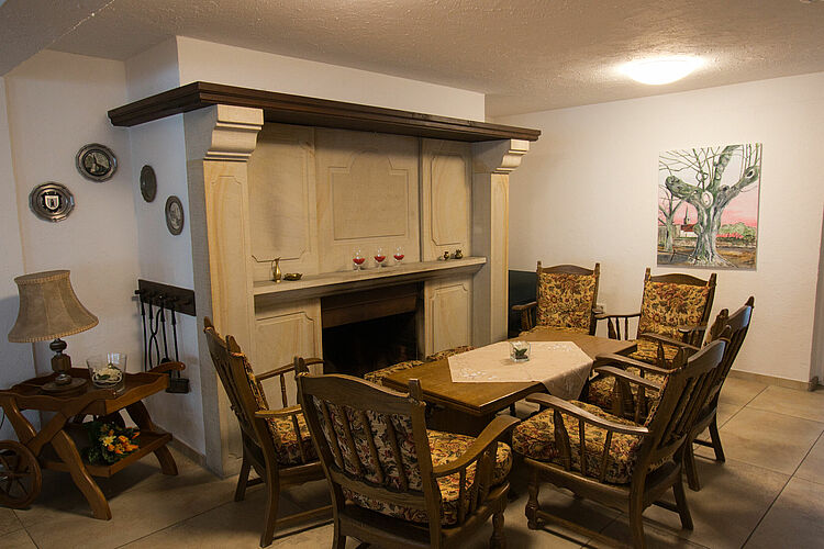 Das gemütliche Kaminzimmer im Eingangsbereich lädt zum Verweilen und zum Klönen ein - leider ohne flackerndes Kaminfeuer. Hier heißt es: Der Ofen bleibt aus!